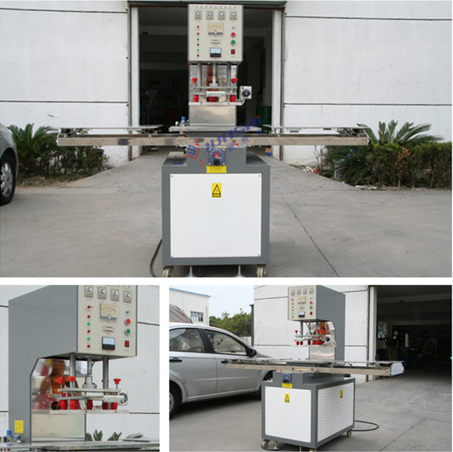 通過人工放料,高周波自動熱合壓邊切熔,定型,工作時通過人工放料,放入模具位置上,按起動開關(guān),底部模具滑板自動滑動到固定工作位置,機頭氣缸驅(qū)動工模下降,通過延時預熱、高周熔接、切斷、定型,定型完畢機頭上升,底部工模滑板自動滑出,人工取出成品。在生產(chǎn)中可自由設(shè)置各部時間,一般為3--6秒一個作業(yè)過程。